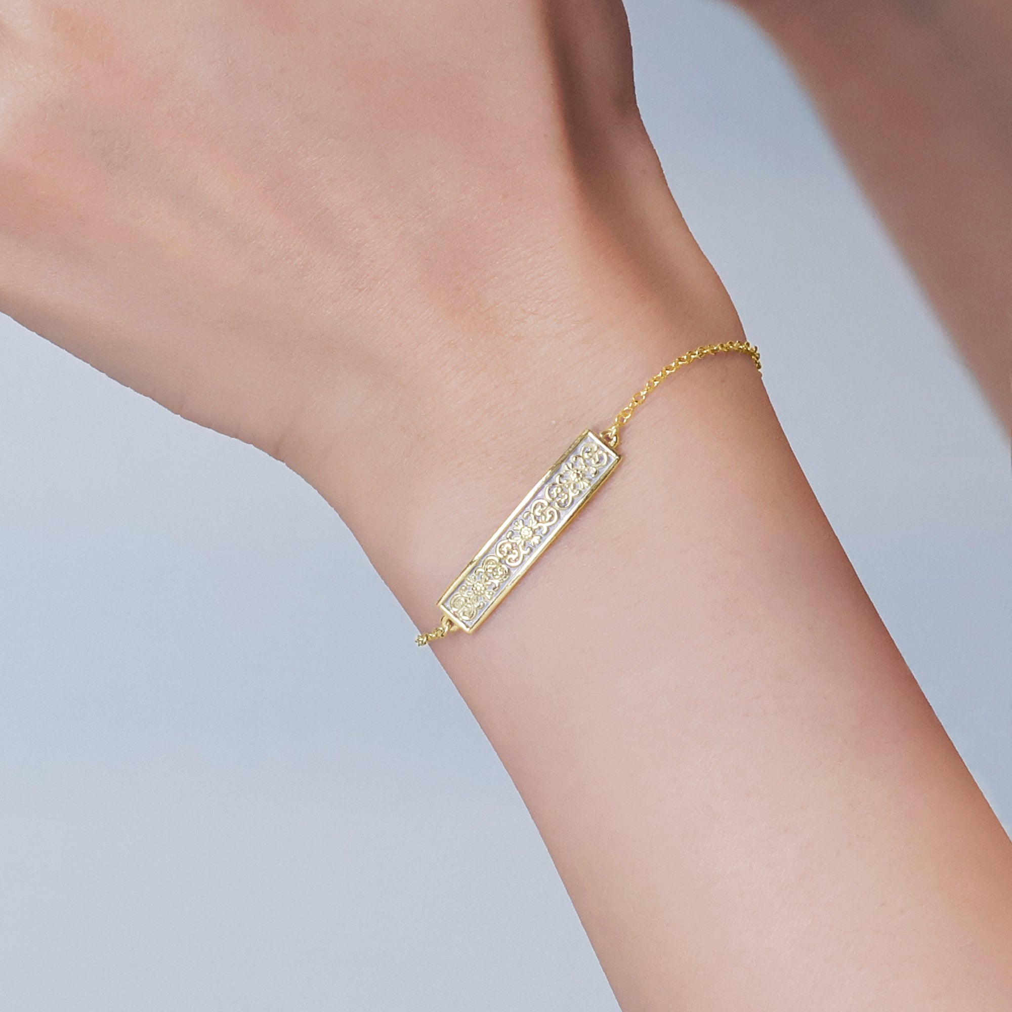The Beatitude Bracelet from our Baroque collection showcases an exquisite ornamental charm 5.5mm wide and 28mm tall with applied coloring to enhance tonal shading and depth, gracefully suspended on a rhodium-plated silver chain. Its adjustable design spans 14.5 to 20.5 inches, ensuring a perfect fit for any wrist. This refined piece masterfully merges baroque grandeur with modern elegance, offering a timeless accent to elevate your personal style.