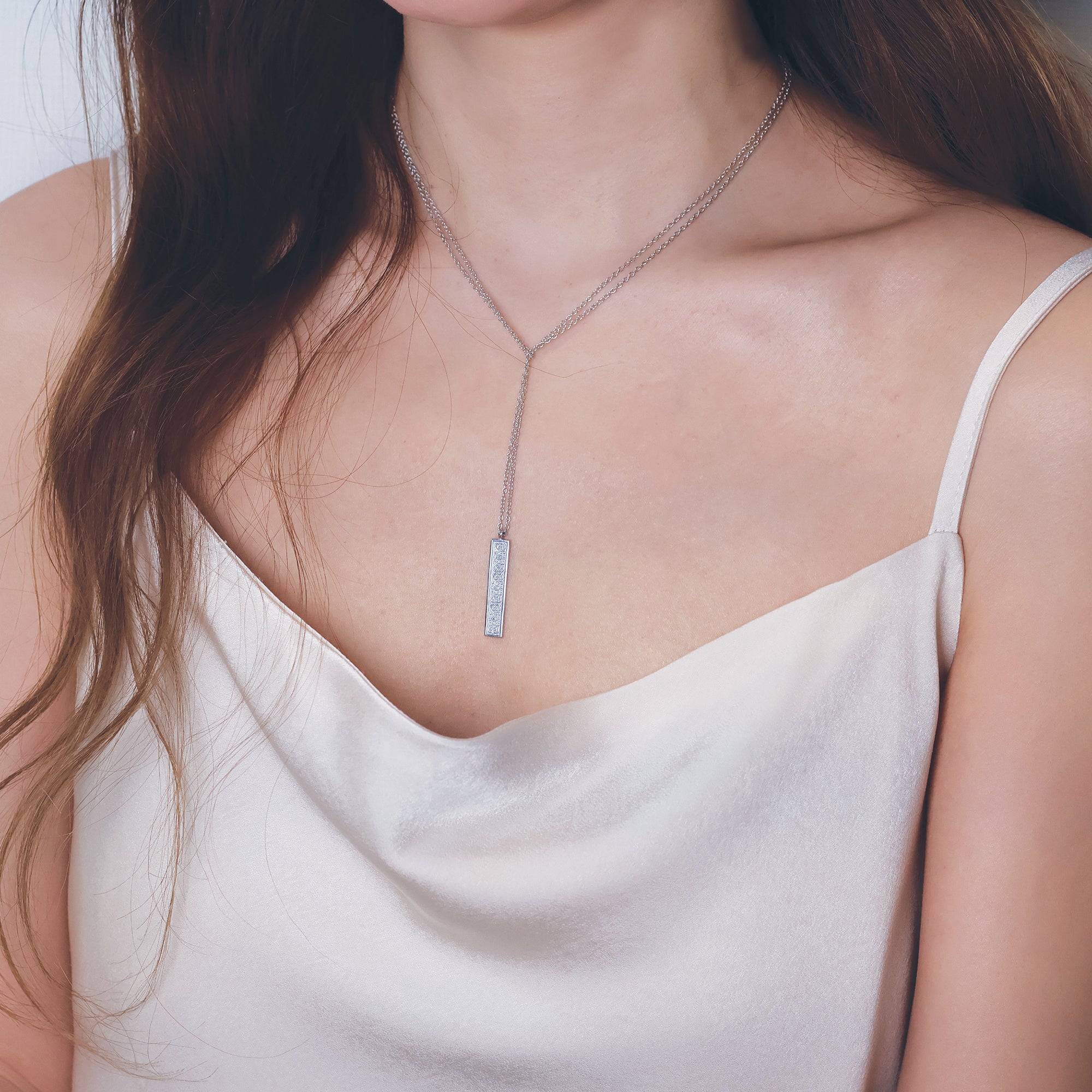 The Sanctity Necklace from our Baroque collection showcases intricate engraved patterns on a refined pendant measuring 5.5mm wide by 30.5mm tall. Crafted in rhodium-plated silver with applied coloring to enhance tonal shading and depth, for two-way styling, allowing it to be worn at its full length or adjusted shorter. The adjustable chain extends from 85–90mm, allowing you to customize the fit to your preference. A timeless piece that balances ornate detail with understated elegance.