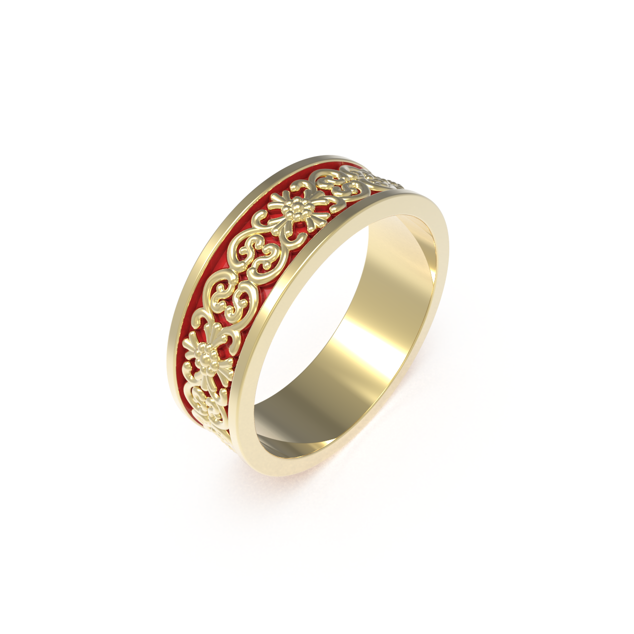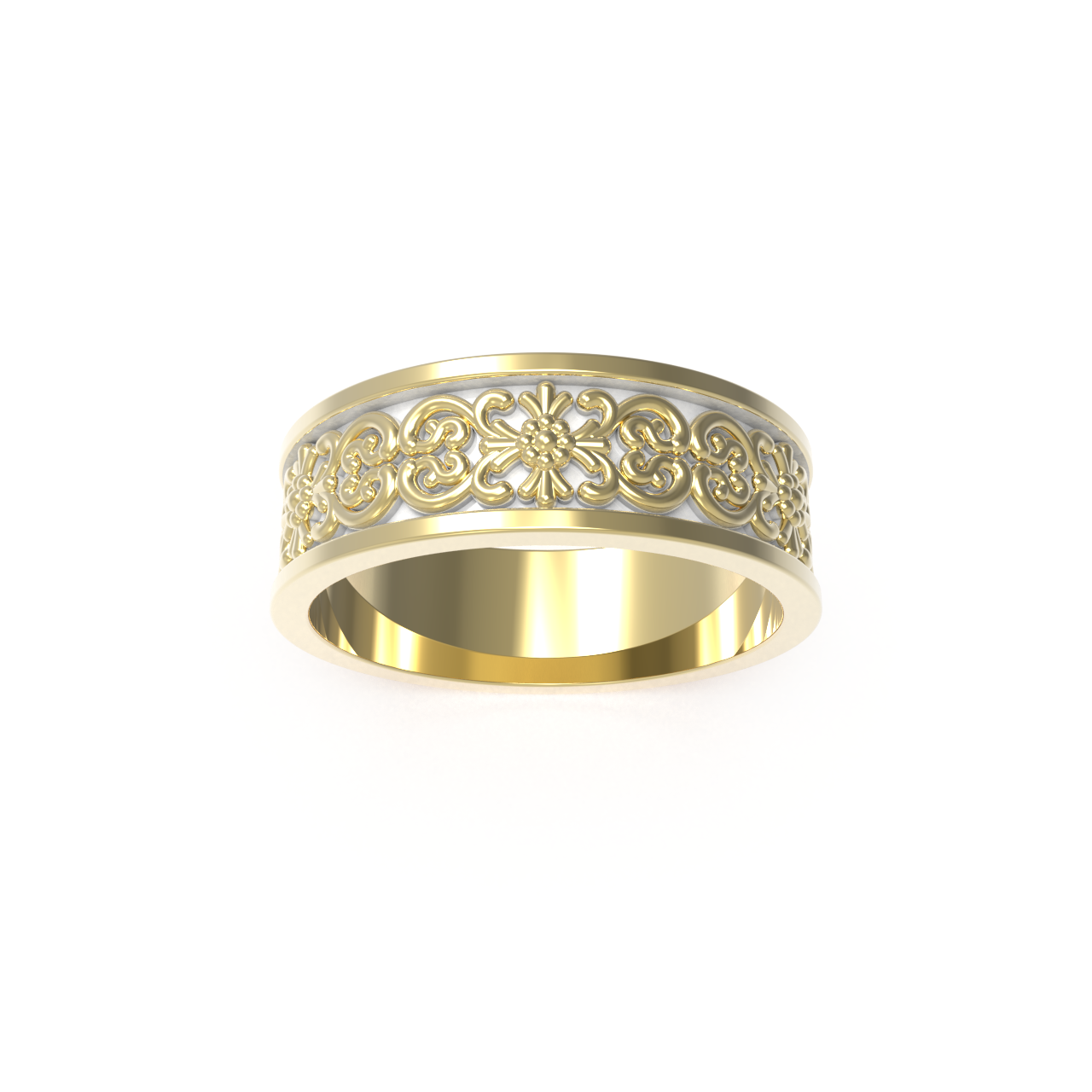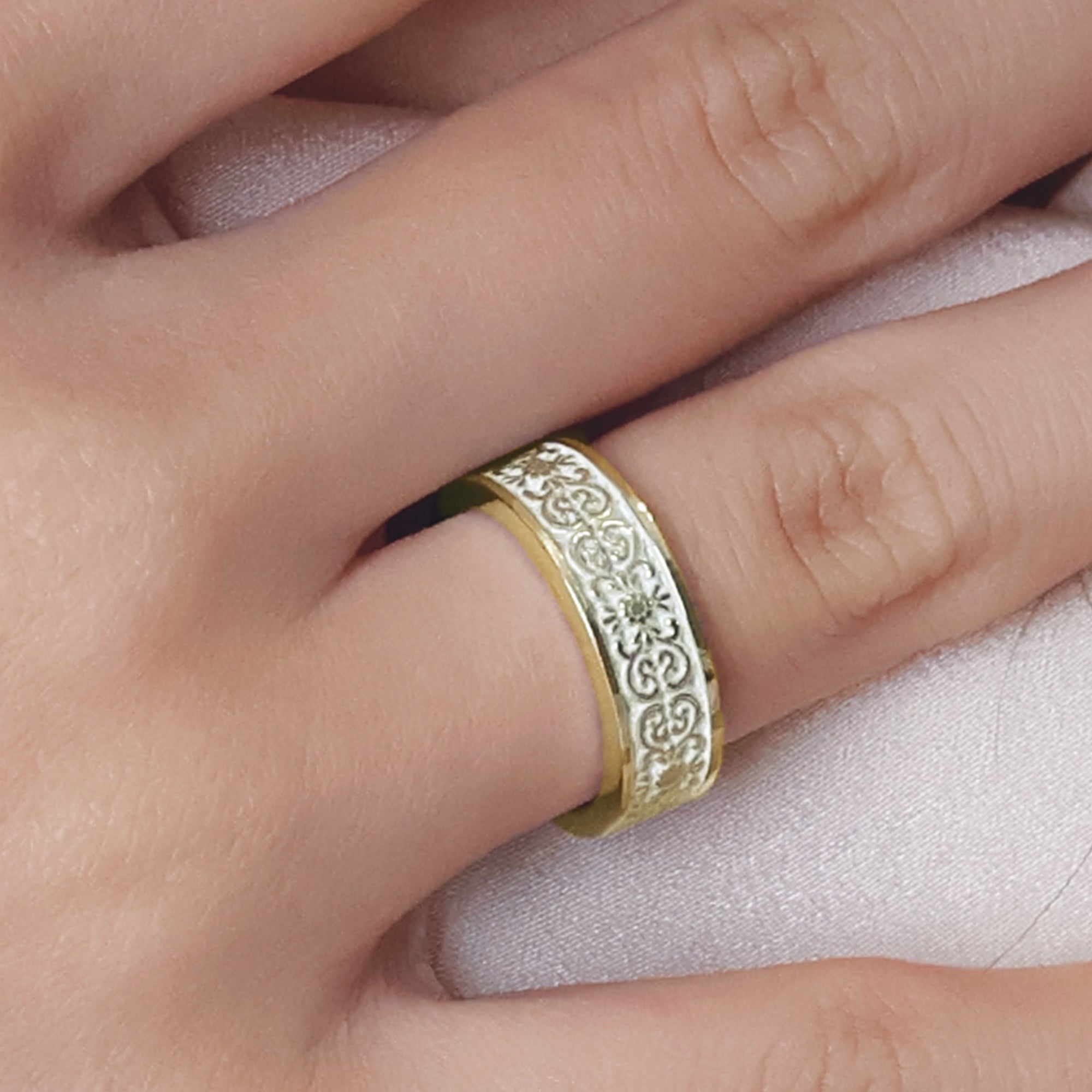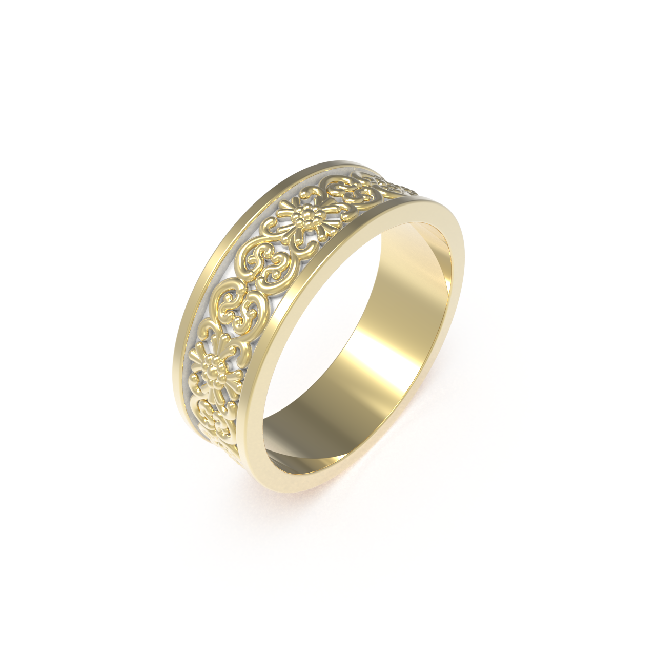The Solemnity Ring from our Baroque collection embodies the splendor of classical craftsmanship. This sophisticated band, rendered in gold-plated silver with applied coloring to enhance tonal shading and depth, measures 6mm in width with a refined 1.7mm profile that delivers both presence and wearable comfort. Ornamental engravings inspired by nature's finest forms dance across the surface, celebrating the decorative richness of baroque aesthetics. A timeless testament to commitment, this piece elevates your most cherished moment into an heirloom of enduring elegance and distinction. (Ring width and thickness are based upon a standard 13 ring size, actual ring proportions may vary)
