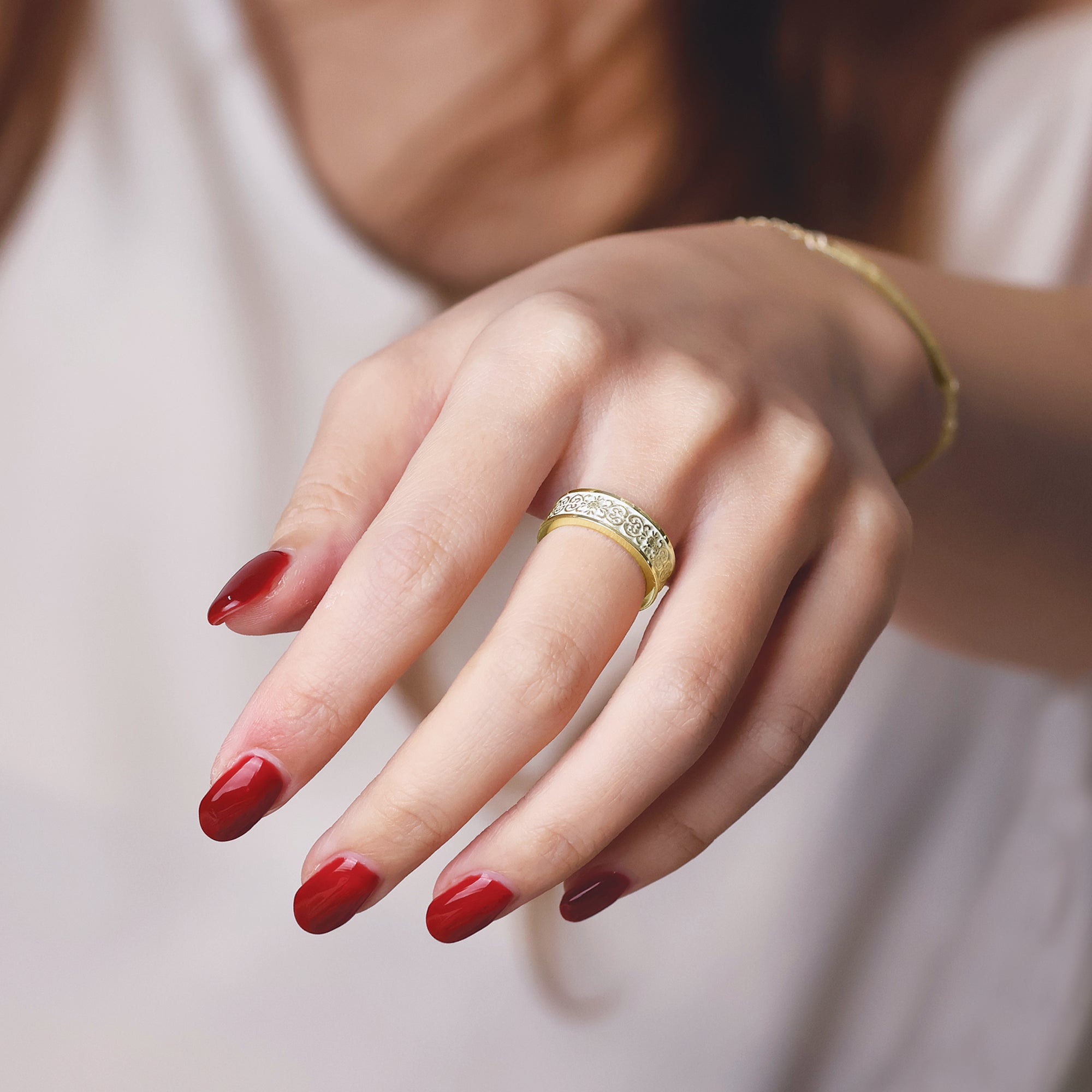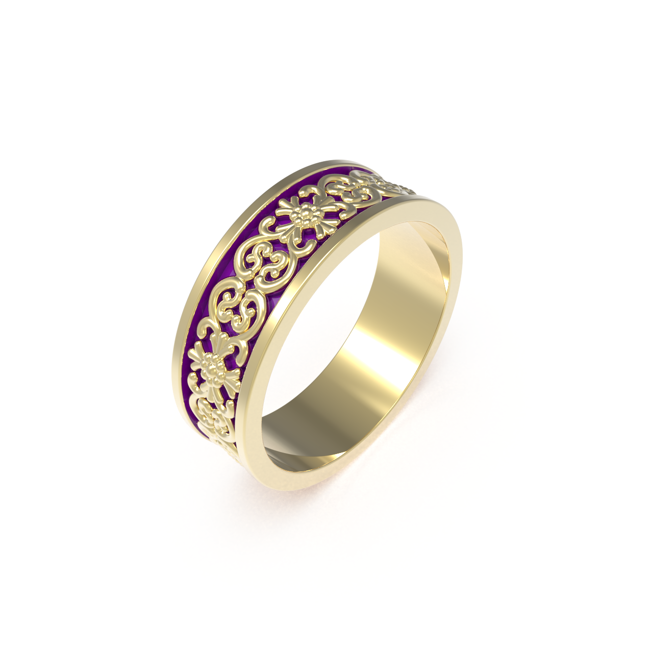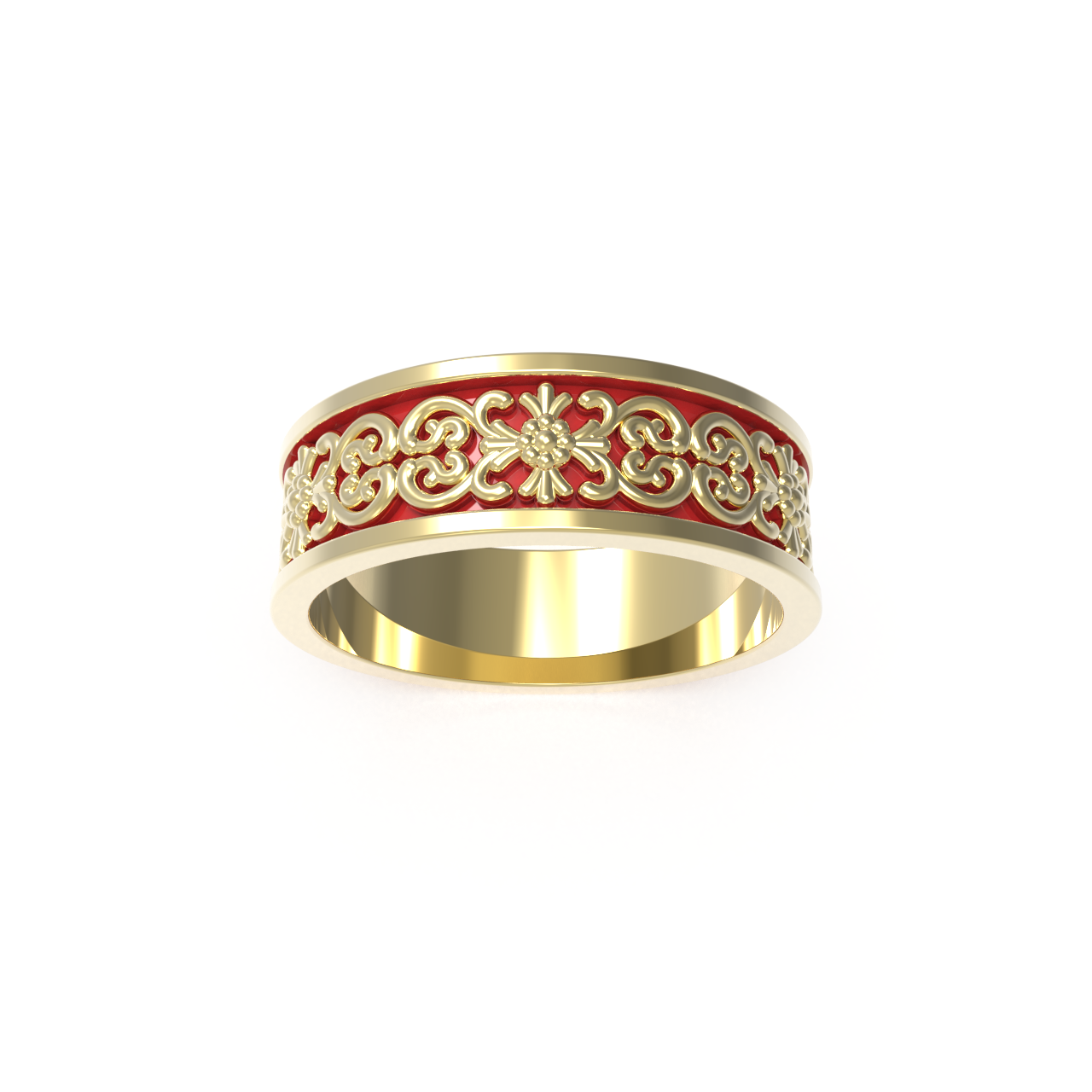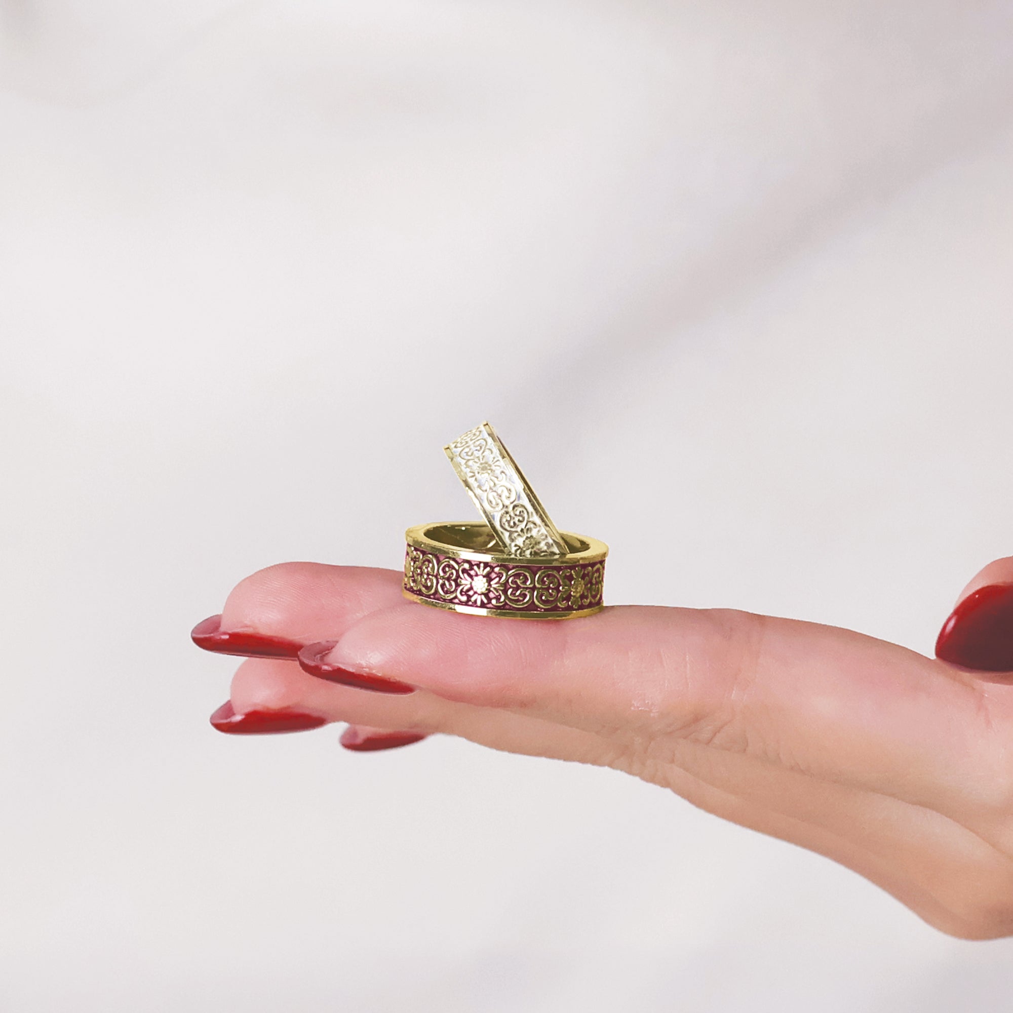 The Solemnity Ring from our Baroque collection embodies the splendor of classical craftsmanship. This sophisticated band, rendered in gold-plated silver with applied coloring to enhance tonal shading and depth, measures 6mm in width with a refined 1.7mm profile that delivers both presence and wearable comfort. Ornamental engravings inspired by nature's finest forms dance across the surface, celebrating the decorative richness of baroque aesthetics. A timeless testament to commitment, this piece elevates your most cherished moment into an heirloom of enduring elegance and distinction. (Ring width and thickness are based upon a standard 13 ring size, actual ring proportions may vary)